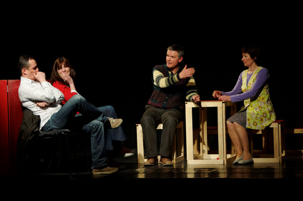 Sur scène deux couples miroirs se déchirent autour de leur assiette, encadrés par deux régisseurs zélés, et rejoint s par deux spectateurs indélicats. La discussion s’envole, les comédiens explosent, jeux d’ombre, de voix, de mimes, de chant, tout y passe, le public est scotché on en redemande !
