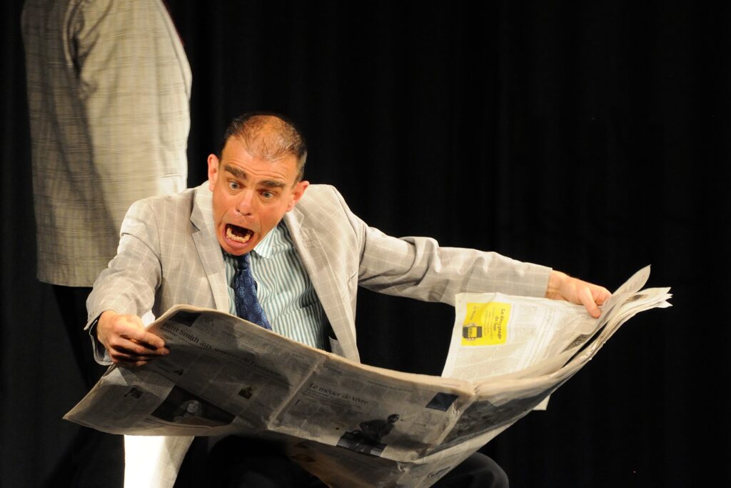 Bref, on touchait de nouveau à la totale illusion hier soir en notre bonne vieille salle des fêtes : des comédiens, des marionnettes, des facteurs aquatiques, des journaux « vivants »,…. Le délire absolu, on ne s’arrête pas de naviguer sur une mer en folie, où vont-ils aller ? Jusqu’où vont-ils s’arrêter ? Un brin inquiet, les spectateurs montaient de palier en palier, jusqu’à l’inexorable : qui va-t-on manger ? Une interprétation sans faille, des mimes hallucinants de justesse, une cohorte d’acteurs débridés, les trois pièces n’en font plus qu’une : un doux rêve confus… où tout s’enchaine, en toute logique… et où tout prend sens car l’on y croit… et hier, on y croyait.